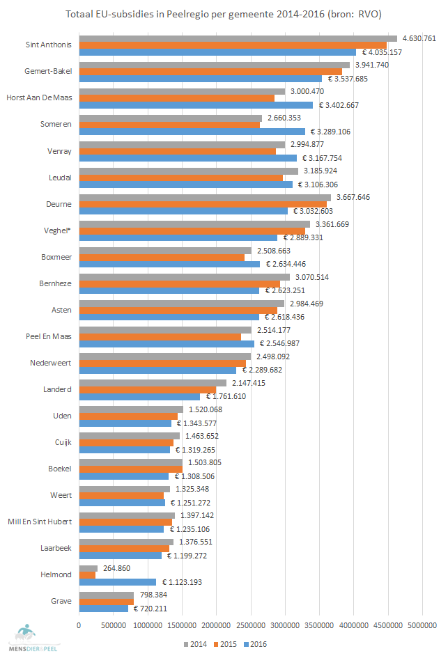 BRUSSEL – De agrosector in Nederland heeft in 2016 in totaal ruim 780 miljoen euro subsidie ontvangen van de Europese Unie. Van dit bedrag werd 114 miljoen euro uitgekeerd aan boeren en tuinders in de provincie Noord-Brabant en bijna 54 miljoen euro in Limburg. Dat blijkt uit gegevens van de Rijksdienst voor Ondernemend Nederland (RVO). Evenals voorgaande jaren ging hiervan het grootste deel (47,5 miljoen) naar agrobedrijven in de Peelregio. Laat dit nu net de regio zijn met de hoogste veedichtheid en daaraan gerelateerde druk op milieu en leefomgeving.