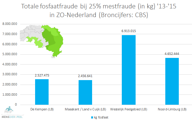De omvang van de fraude met fosfaat lag tussen 2013-2015 in ZO-Nederland op circa 16,5 miljoen kg. Deze hoeveelheid is opnieuw gebaseerd op een fraudepercentage van 25%.