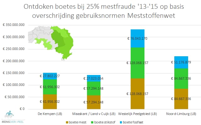 Daarin staat dat er voor elke kg stikstof boven de stikstofgebruiksnorm een boete van €7 betaald moet worden. En voor elke kg fosfaat boven de fosfaatgebruiksnorm een € 11 boete. Daarbovenop komt een boete van €7 voor elke kg stikstof afkomstig van dierlijke mest boven de EU-gebruiksnorm van 170 kg per hectare. In onderstaande berekening is de hoeveelheid stikstof die aanwezig is in de gefraudeerde mest tevens gehanteerd als overschrijding voor de gebruiksnorm van dierlijke mest.