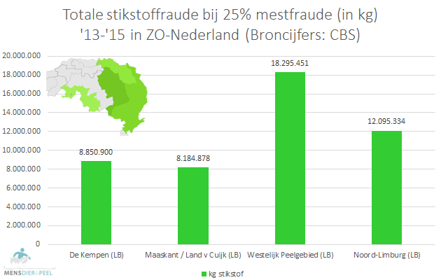 Tussen 2013-2015 is er in ZO-Nederland circa 47,5 miljoen kg stikstof verdwenen. Het is aannemelijk dat ook deze fraude ook in de jaren daarna en mogelijk ook daarvoor heeft plaatsgevonden. De totale omvang van de mest- en stikstoffraude is dus waarschijnlijk aanzienlijk hoger. Dit kan een verklaring zijn voor de hogere stikstofdeposities op diverse locaties in Brabant, zoals gerapporteerd door het RIVM via het Meetnet Ammoniak in Natuurgebieden (MAN). Ook de oppervlakte- en grondwaterkwaliteit laat te wensen over, met name in Oost-Brabant, zoals diverse malen gerapporteerd door het Planbureau voor de Leefomgeving.