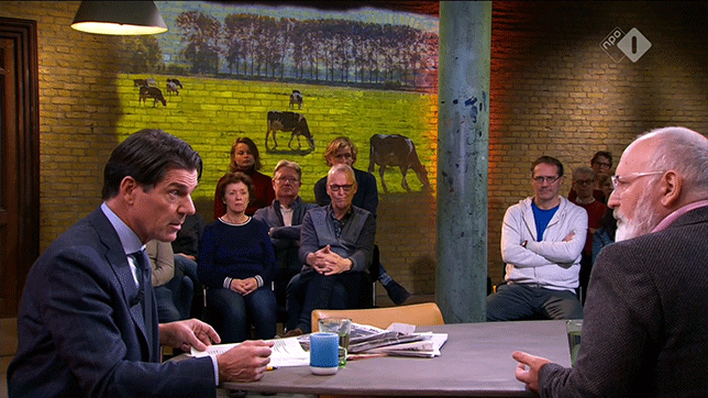 Timmermans: “Dat is de vraag of je daar op deze schaal mee moet doorgaan. Dat is een vraag die Nederland zal moeten beantwoorden. Die ga ik niet vanuit Brussel sturen. Daar zal Nederland over moeten nadenken. Weet u: boeren zijn over het algemeen mensen die daar heel lang en nuchter over nadenken en die heel goed weten hoe het zit. Die nu vaak vanuit een wanhoop roepen doe iets, help ons hieruit te komen, maar die ook wel weten dat het zoals het nu is niet door kan gaan.”