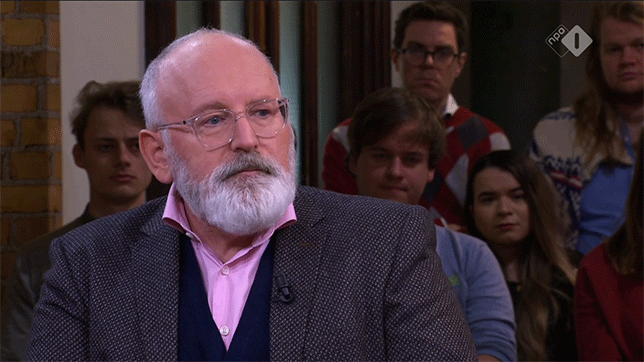Timmermans: “We kunnen als Commissie niets afdwingen. We kunnen alleen maar voorstellen doen. Maar laten we eens bij het begin beginnen. Zullen we de feiten eens laten spreken. Zo gaat het niet langer. Stel dat je door een telescoop zou zien dat er een komeet op de aarde afkomt en dat die over 30 jaar hier zou kunnen zijn en die zou verwoestend kunnen zijn. Zeggen we dan ook allemaal ‘daar gaan we niet aan meedoen’?”