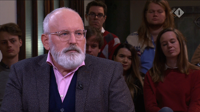 Timmermans: “Dus… Maar we moeten ook voedsel op tafel krijgen. Dus moeten we ervoor zorgen dat er minder pesticiden worden gebruikt. Dat je de landbouw inzet om herbebossing voor elkaar te krijgen. Ik zou graag zien dat er twee miljard bomen bijkomen in Europa de komende jaren. Dat je boeren daar een rol bij geeft en dat je daar een vergoeding tegen over stelt. Wij kunnen niet zonder boeren. Dat wil ik ook even duidelijk stellen.”