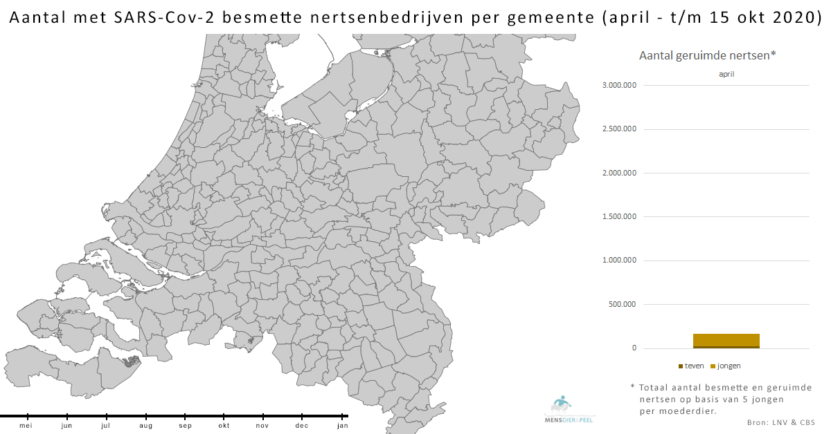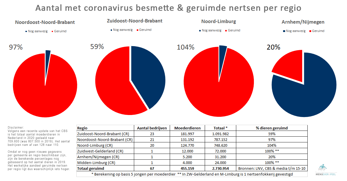 Volgens LNV zijn er tot en met 15 oktober 2020 459.000 moederdieren geruimd. Het CBS geeft aan dat er in 2020 709.600 moederdieren (teven) aanwezig waren in Nederland. Een jaar eerder waren dat er nog 807.500. Het aantal bedrijven daalde van 128 in 2019 naar 110 in 2020. Met de besmetting van een nertsenfokkerij in Heumen (Gelderland) op 22 september was de helft van alle nertsenbedrijven in Nederland geïnfecteerd met het virus.