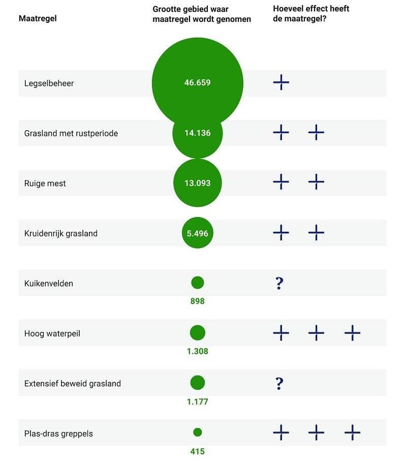 Maatregelen om weidevogels te beschermen. Grootte van het gebied waar de maatregel wordt genomen in hectaren (bron: RVO), afgezet tegen het effect ervan (bron: onder meer Wageningen University & Research).
