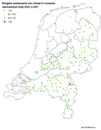 Deze kaart (bron: RIVM) toont de maximum nitraatconcentratie in het per winning opgepompte (gemengde) grondwater in 2011 (data uit REWAB-database). Vierlingsbeek (bij Boxmeer) is de rode stip op de kaart. De veesector heeft jarenlang ontkend dat sluiting van dit waterwinstation iets te maken had met verhoogde nitraatconcentraties.