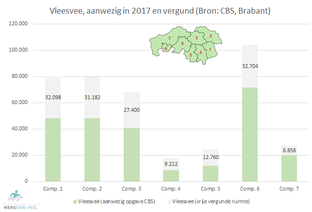 Op deze pagina staan cijfers over het aantal aanwezige runderen per compartiment en per gemeente (situatie december 2017). De grijze top geeft de potentiële (vrije) ruimte aan op basis van verleende vergunningen. De gekleurde balk geeft het aantal aanwezige dieren aan volgens opgave van het CBS. Gekleurde + grijze balk geven bij elkaar opgeteld het totaal aantal vergunde dieren aan per compartiment. De grafiek maakt duidelijk dat de veestapel, ondanks de reeds aanwezige veedichtheid, nog steeds verder kan toenemen.